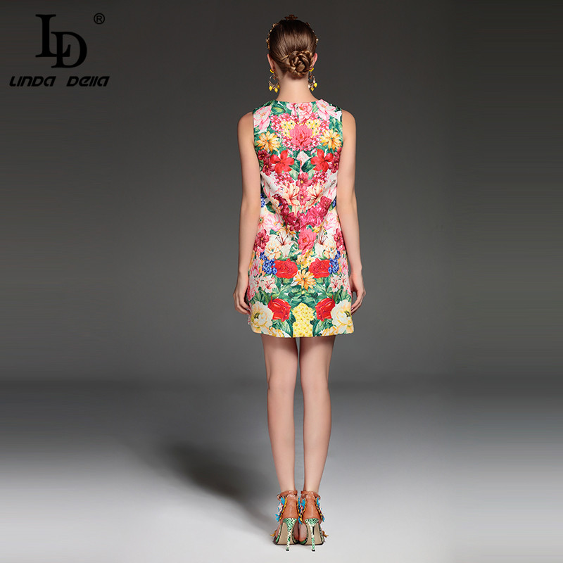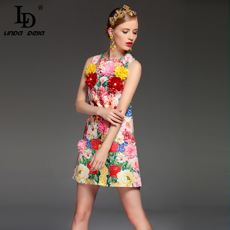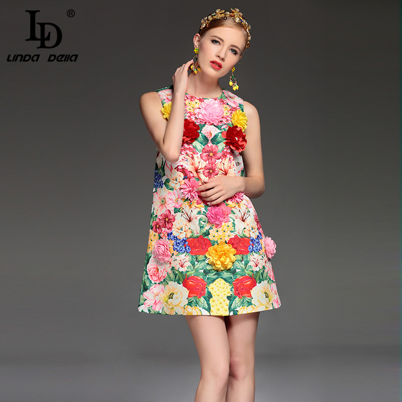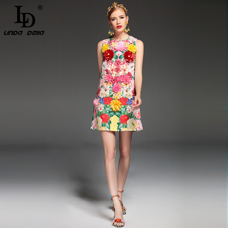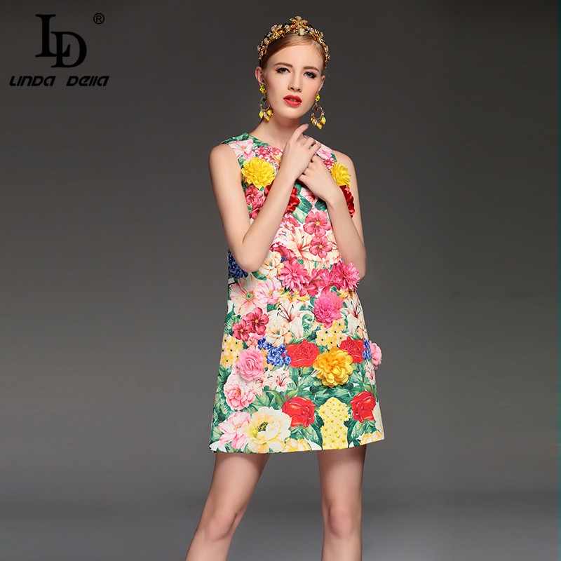 High Quality 2017 Summer Fashion Designer Runway Dress Women’s elegant Sleeveless Tank Floral Print Flower Applique Short Dress